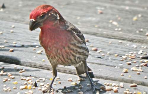 Male house finches are usually red, with the intensity depending on the season. Their coloration is derived from the fruits and berries in their diets. Female house finches tend to be light brown with white streaks. (Photo by Lynn Axelrod)