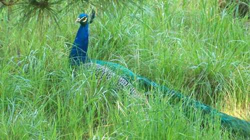 When it comes to coloration, however, no other bird around Mitchell cabin can match this lone, male peacock, which for three years has been hanging out with a flock of wild turkeys. Peafowl which originated in India were introduced on the US mainland in California back in 1879.