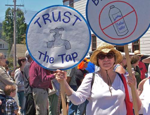 Lynn Axelrod was among the MainStreet Moms calling for people to drink tap water rather than bottled water, which clutters the environment with plastic bottles. Mom Kathryn Callaway created the signs for her sisters.