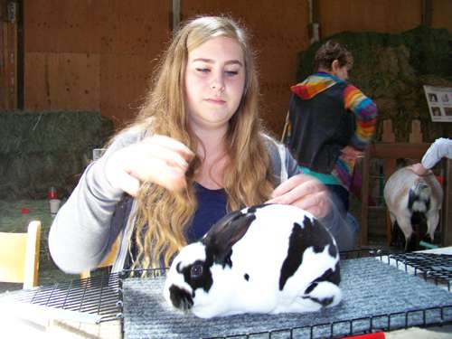Megan Binford, 14, of Tri-Valley 4-H, shows a four-month old Broken Black Mini-Rex doe named Ribbons, or, as a local rancher quipped, “a Holstein rabbit.”
