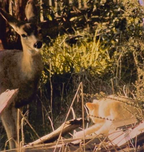 A curious doe watches a cat cleaning itself outside our kitchen door.