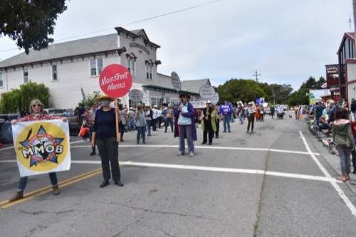 The group of political progressives, Indivisible West Marin, was well represented in the parade, joining with Mainstreet Moms, a group of female activists, made up of both real moms and honorary moms. Sitting in the vehicle driven by Charles Gay are (left to right) Kathy Hunting, Wileen Sweet, Pam Ross, urging everyone to vote.