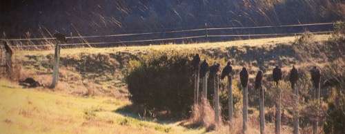 I dragged the body to the edge of my field (at left), and buzzards (AKA vultures) lined up on fence posts to dine. Maggots too soon began devouring the corpse.