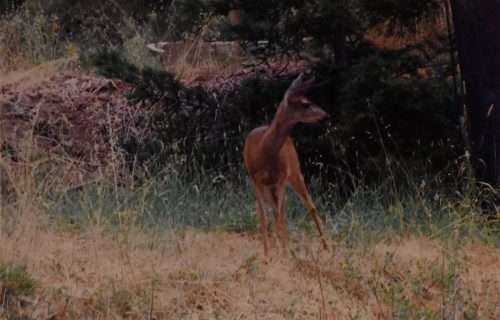 A young buck grazes alone near Mitchell cabin. Most of the year, I can spot blacktail deer around the cabin virtually every day. Herds of 12 and 14 animals are not uncommon. Deer, as most of us know, will eat flowers, vegetables, and shrubbery if given a chance. At Mitchell cabin, any plants I want to protect from deer are grown in containers on my deck. (Photo by Lynn Axelrod)