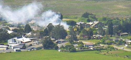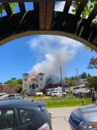 Smoke from a fire at the old Foresters Hall in Point Reyes Station drifted over the town on Friday, April 24. The blaze damaged the northeastern exterior of the landmark, including a porch and staircase. Water damage to two apartments forced the tenants to move out. (Marin County Fire provided this photo)