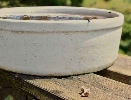 A small bone surprised us by showing up beside our birdbath Wednesday, and I’m fairly sure a raven brought it there for rinsing. From appearances, it is a chicken bone probably found in someone’s garbage.
