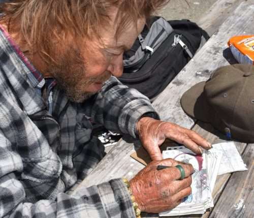 Billy Hobbs was sleeping outdoors in Point Reyes Station when the rain and cold winds hit two winters ago, so Lynn and I offered to let him wait out the bad weather in Mitchell cabin. Once he did, Billy was able to resume showering and getting his clothes cleaned regularly. Add to that a haircut and a beard trim, and he had dramatically cleaned up his act.