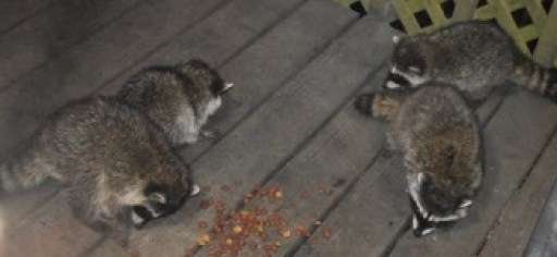 Roof rats just as inevitably show up to finish off the leftovers. Here four rats gobble down what the birds left behind.