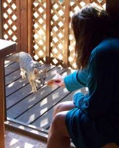 Lynn and I scatter birdseed morning and evening on our front deck’s railings and benches.