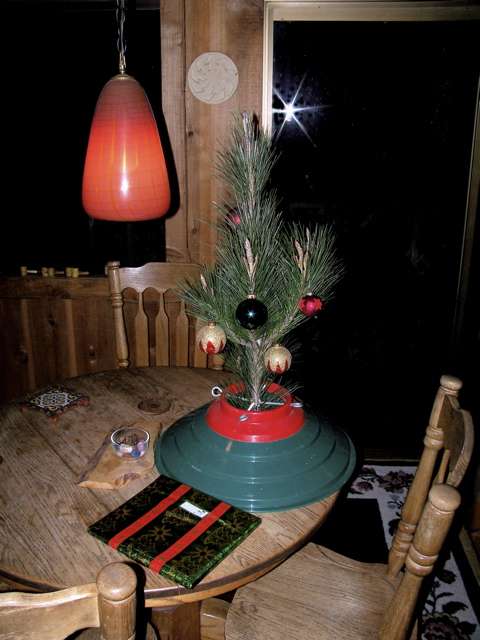 ‘What the heck?’ I thought and stuck it in a stand almost as big as the “tree” itself. My little Tannenbaum had room for only a few ornaments, but that was fine. And when I took a picture of it, the camera’s flash serendipitously created a Star of Bethlehem on a window behind the tree.