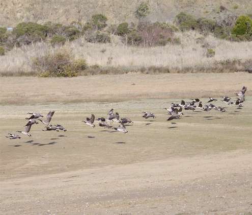 Before: Canada geese take flight from a dry cove on the east side of Nicasio Reservoir last November.