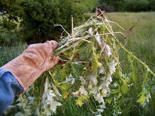 However, as I told Mike, even when I’m wearing work gloves, the thistle spikes manage to work their way through the back of the gloves and into my hands. The same thing had happened to Mike. The solution, he said, are gloves totally covered with tough leather: “They’re called welders’ gloves.”