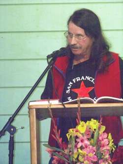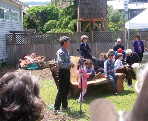 Creating the massive bench was Rufus Blunk of Inverness (at microphone). He is the husband of Elizabeth Barnet, who with Mr. Rowe co-founded the West Marin Commons project.