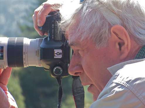 Tim Page on my deck photographing horse riders in a neighboring field.