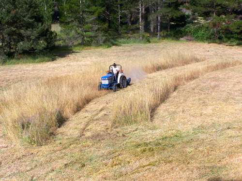 With the summer fire season almost upon us, I finally had my fields mowed last Friday. Most of the grass was already dry, and tractor owner Gary Titus brought a rig down from Tomales to do the work.