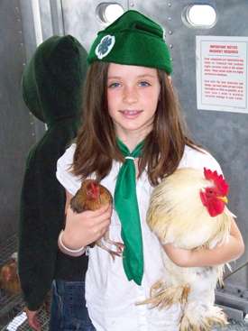Phoebe Blantz of Nicasio, who won a second-place ribbon in poultry competition, entered a white Old English rooster named Chief and a brown Old English game hen named Princess.