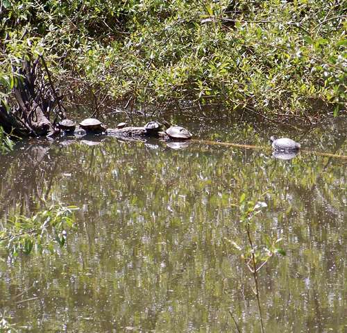 Basking western pond turtles, such as these at the Gonzalezes’ pond in May 2010, can be aggressive in making sure they have enough room. Usually this consists of biting and ramming other turtles to push them off their perch. Luckily, such aggression is usually over by noon, which leaves the afternoon free for sunning. Or so I read.