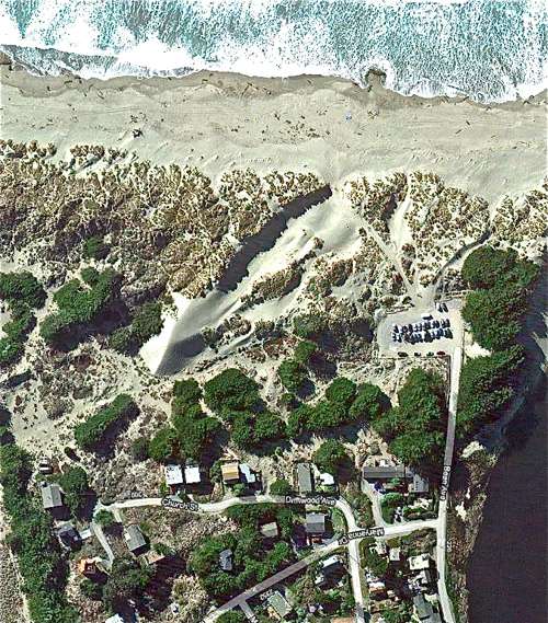 The denuded sand became a moving dune — a mass of windblown sand 40 feet high — covering the forest and its bird and animal habitat, approaching our roads and homes. Strong onshore afternoon winds continually pile up more sand. Only a small section of the forest still survives.