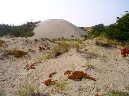 In the early 1980s, heavy equipment uprooted vegetation in a section of coastal dunes. With ground cover gone in this area, sand began drifting through the gap and creating this dune, which is now crossing public land and will soon reach private land. Plants and a small forest are being buried by the advancing dune.