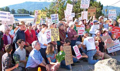 Among those assembling to be photographed at West Marin School was Congressional candidate Norman Solomon (in blue shirt). Sunday’s protest lasted less than half an hour and caused no disruptions.