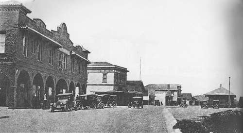 The main street of Point Reyes Station in 1920 with the brick Grandi Building at left and the depot at right.
