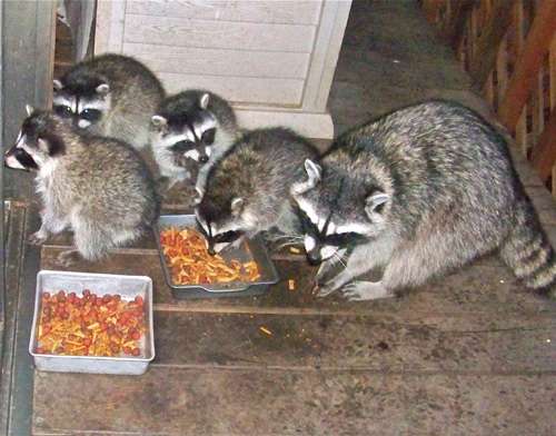 Lynn and I have seen a fox grab a slice of bread out from under the tail of a raccoon, and we have seen raccoons grab bread that was intended for a fox.