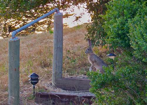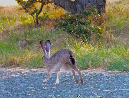 Point Reyes Station naturalist Jules Evens notes in his book The Natural History of the Point Reyes Peninsula that the large jackrabbits, also known as black-tailed hares, around here have “elongated hind limbs” which enable them to “spring long distances and make sharp turns. To avoid predation, the black-tail uses an element of surprise and escape that works well.”