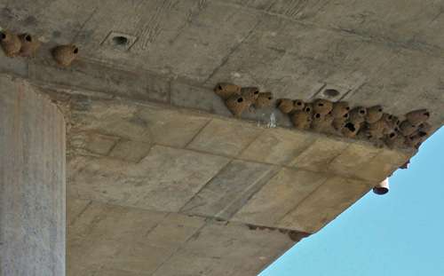 While looking down on the bridge from the bluffs above revealed its grace, looking up at the bridge from our canoe revealed numerous clusters of swallow nests. The chance to see the nests was one reason I personally wanted to go canoeing.