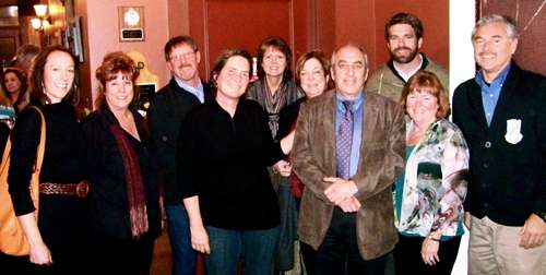 School officials who arrived early at the party (from left): Jill Manning-Sartori, Shoreline School District trustee; Jane Realon, principal at Tomales Elementary and Bodega Bay schools; Tim Kehoe, president of Shoreline’s board of trustees; Jane Healy, trustee; Susan Skipp, Shoreline business manager; Penny Valentine, special education director for the county office of education; Steve Rosenthal, retiring superintendent; Adam Jennings, Tomales High’s principal; Nancy Neu, Shoreline’s incoming interim superintendent; and Matt Nagle, principal of West Marin-Inverness schools. Other trustees showed up later.