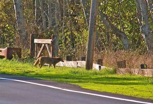 A coyote has begun showing up on the shoulders of Point Reyes Station’s heavily used levee road. It’s a bit unusual but not altogether surprising. For much of its length, the levee road is what separates US Park Service-owned Olema Marsh from the county park at White House Pool. My partner Lynn and others had reported seeing the coyote along the road, and on Tuesday, I finally got a chance to see it for myself. Which gets us back to wild turkeys.