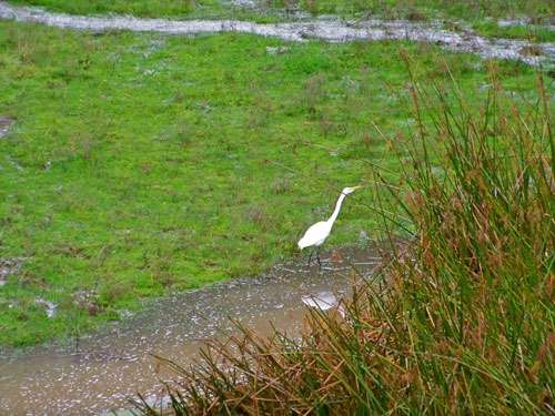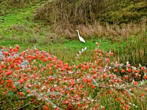 Although it was drizzling at the time, the egret in its red and green surroundings provided an unexpected bit of yuletide cheer.