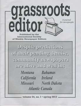 In contrast, the spring issue of Grassroots Editor headlines a spot-check of far-flung weeklies, “Despite predictions of their pending demise, community newspapers are alive and well in: Montana, Bahamas, California, Ireland, Missouri, North Dakota, Atlantic Canada.”