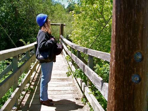 As Lynn observes, Marin County Parks and Open Space Department periodically cuts back the poison oak that protrudes through the railing of the White House Pool footbridge. A member of the department staff on Monday told us the frequency of cutting depends on what staff observe and what the public reports to the county.