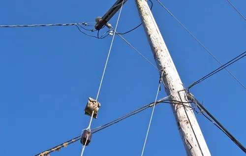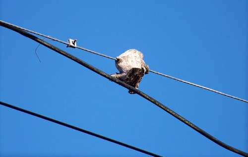 Nor is there only one overhead reminder of arboreal history. Further down Drake Way on the other side of the utility pole, another limb had grown around a pole-to-pole cable. The tree may be gone, but this relic of a limb remains.