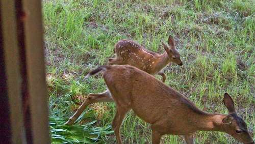 A purposeful doe and her small fawn hurry past the bedroom window.