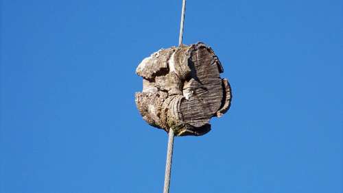 A closeup reveals how thoroughly the cable became embedded in what remains of a long-gone branch of a long-gone tree.