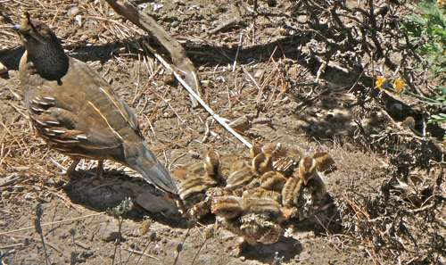 A mother quail marched across the yard a week ago as a dozen chicks ran to keep up. Males and females both have crests. The males’ is black, the females’ brown. (Photo by Lynn Axelrod)