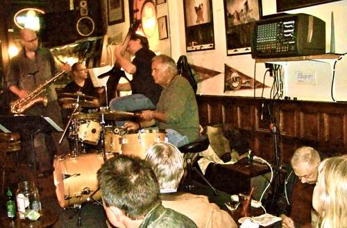Rob Roth on sax, KC Filson on piano, PÃerre Archain on bass, and Michael Aragon on drums at the No Name bar in Sausalito. At far right, prominent Sausalito artist Steve Sara sketches the scene.