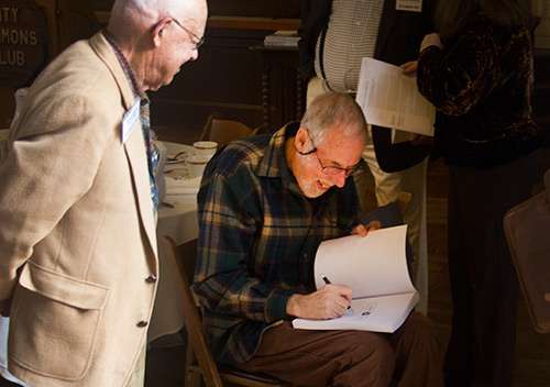I sign a copy of The Light on the Coast for Morton McDonald. The book includes a section on the paper’s investigation of Synanon, an investigation that led to a Pulitzer Prize for Public Service. (Photo by Dave LaFontaine)