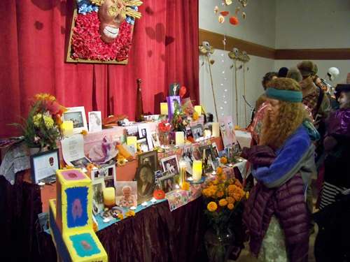 A DÃa de los Muertos altar in the Dance Palace held dozens of photographs of deceased family members and mementos of their lives.