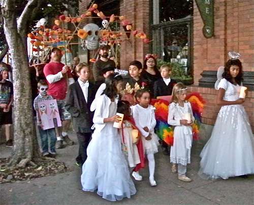 Saturday’s celebration began with a procession from Gallery Route One to the Dance Palace. These young ladies wore angel costumes and looked very sweet while some celebrants wore Halloween costumes which were downright ghoulish.