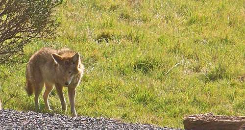 The sloe-eyed coyote emerges from behind a clump of — appropriately enough — coyote brush. Coyotes are close relatives of gray foxes.