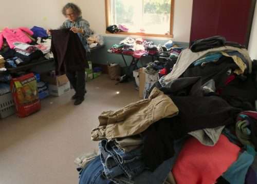 Volunteering at the Dance Palace, where West Marin residents donated piles of clothing for survivors of the fires. Some evacuees had lost much of what they owned.