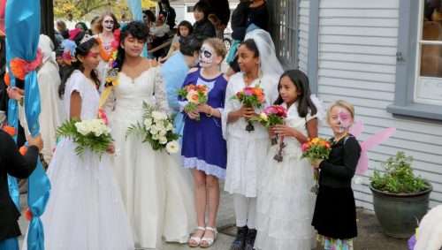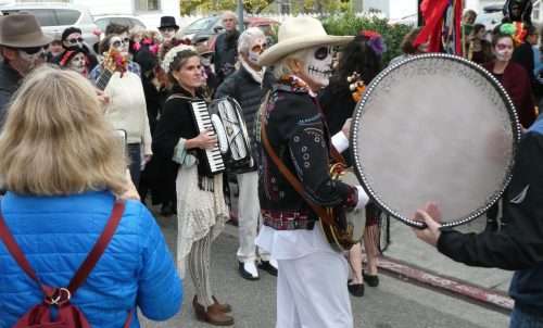 In Point Reyes Station, the celebration began at Gallery Route One with a parade featuring music, dancing, and colorful costumes. Leading music for part of the march were Debbie Daly on accordion and Tim Weed on banjo.