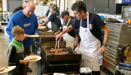 At the firehouse, firefighters cooked a variety of pancakes (regular, vegetarian, or gluten free), sausages and eggs, which they served along with milk, orange juice and coffee. Seen frying sausages is Ken Eichstaedt, manager of Inverness Public Utility District; the district administers Inverness Volunteer Fire Department’s finances.