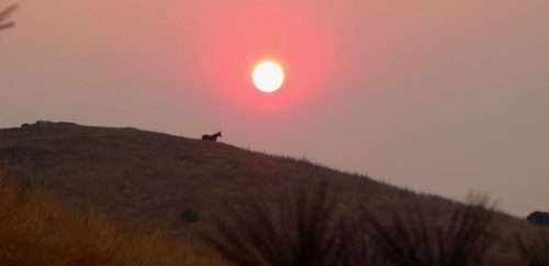 Smoky sunrise — When I awoke this morning, the smell of smoke was in the air, and the rising sun glowing through the haze formed a red disk on the horizon. (Photo by Lynn Axelrod)
