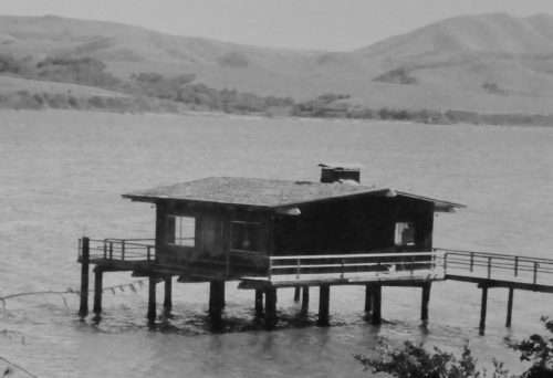 Home on pilings over Tomales Bay —  “Since early days, over-water houses have been a characteristic feature in West Marin,” the exhibition notes. “Two types of construction are evident: buildings which rest partially on land above the high-tide line and extend over the bay on pile supports, and structures built entirely over the water at some distance from the shore and approached on oiled, wooden walkways.” This Inverness home built in 1955 was designed by architect Harold Wagstaff. The display comments this is “perhaps the last of the over-water houses because of coastal regulations.”