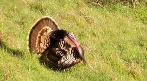 A (Tom) Wild Turkey near Mitchell Cabin. In 1988, a hunting club working with the State Department of Fish and Game introduced non-native turkeys into West Marin on Loma Alta Ridge, which overlooks the San Geronimo Valley. By now there are far more turkeys than turkey hunters, and their flocks have spread throughout West Marin.