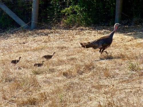 A (hen) Wild Turkey leads her offspring uphill outside our kitchen window.