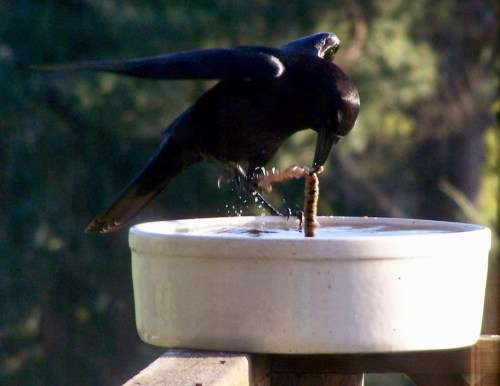 A raven uses the birdbath for skinning a caterpillar.
